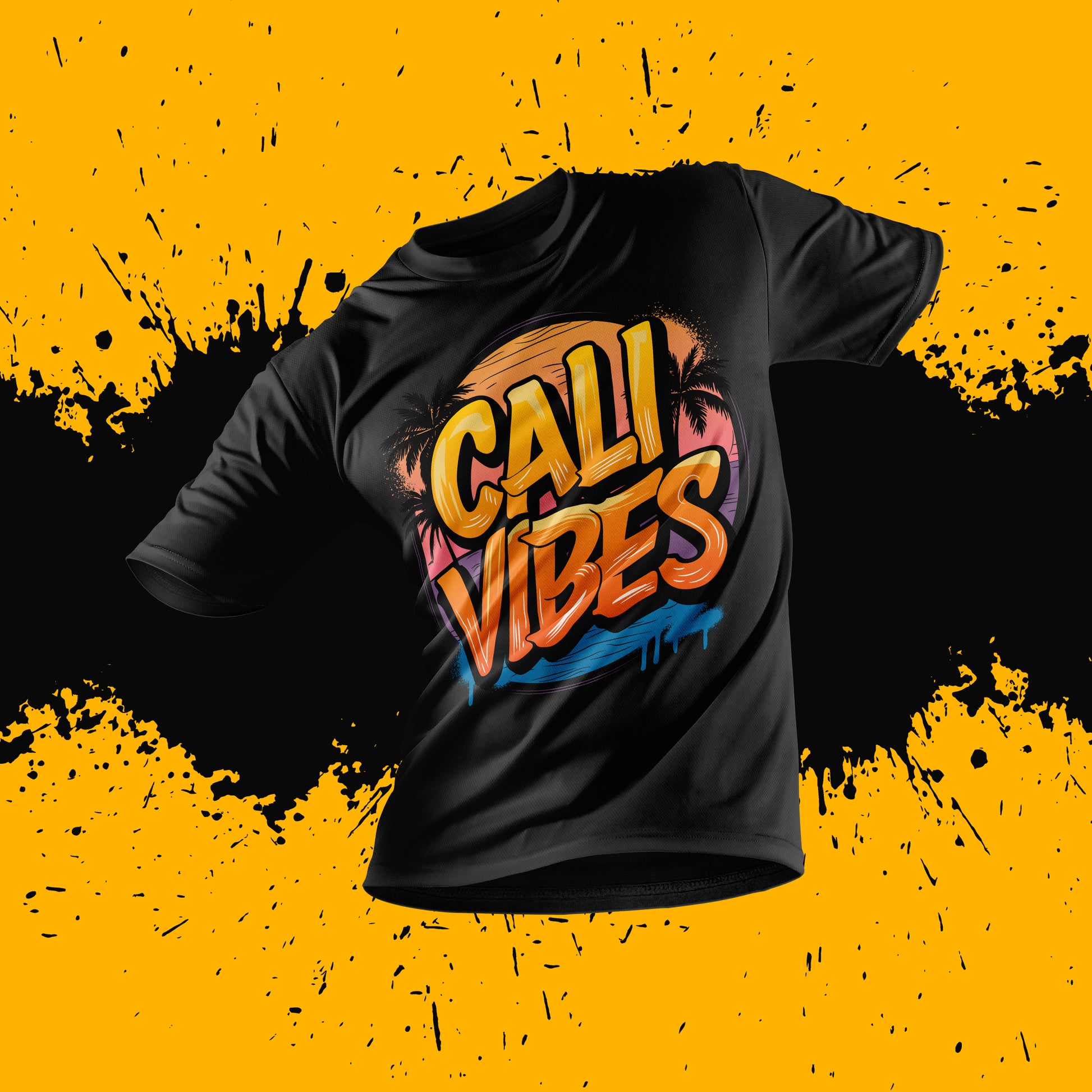 - Bold retro “CALI VIBES” graphic with sunset & palm tree details